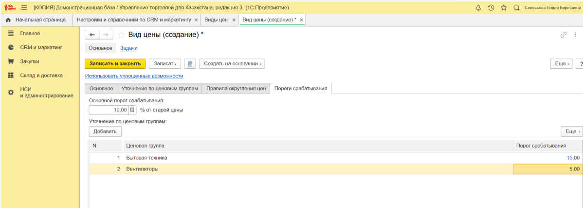 На следующей вкладке можно настроить пороги срабатывания цен. С помощью данной возможности можно задать % изменения, чтобы произошел пересчет цены. Сохраняем вид цены.