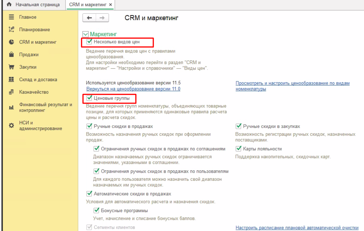 По умолчанию в программе доступно для использования 1 вид цены. Для использования двух и более видов цен необходимо в настройках подсистемы маркетинга активировать соответствующую функциональную опцию.