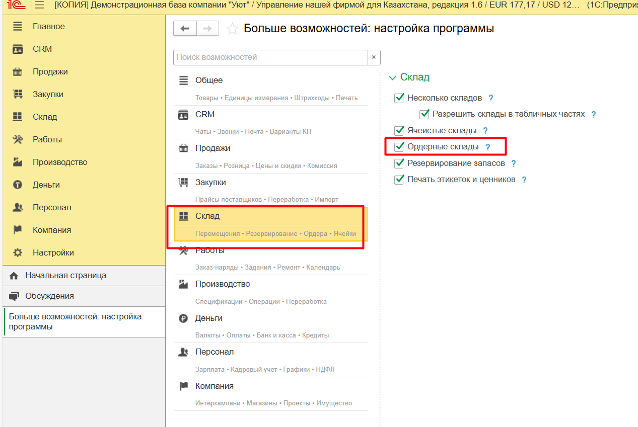Для использования ордерного склада необходимо активировать соответствующую функциональную опцию в настройках подсистемы склада.