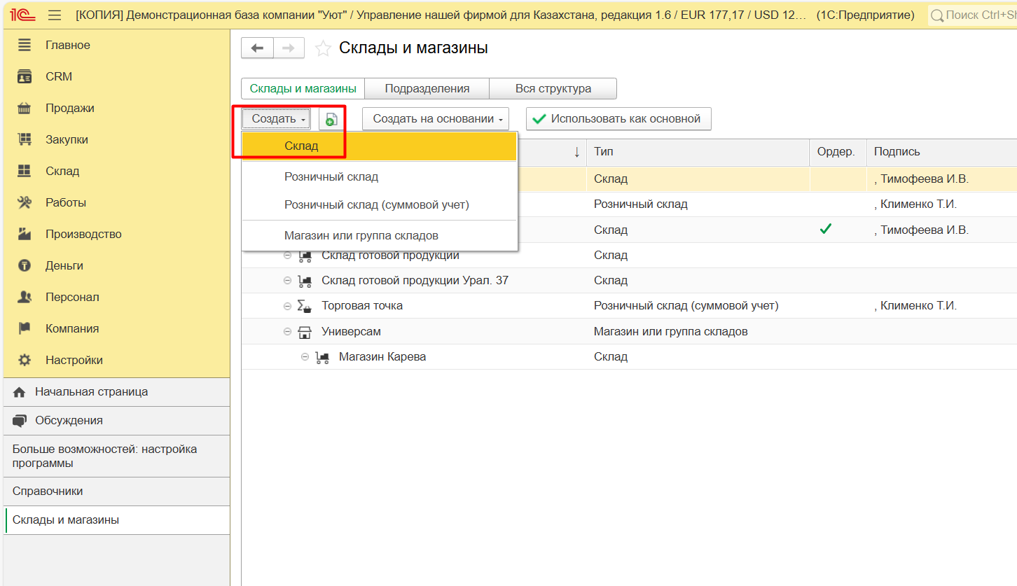 От типа склада зависит то, в каких объектах системы он будет доступен. Например, тип склада – Склад можно использовать как в розничных, так и в оптовых продажах. А тип склада – Розничный склад можно использовать только для торговли в розницу.
