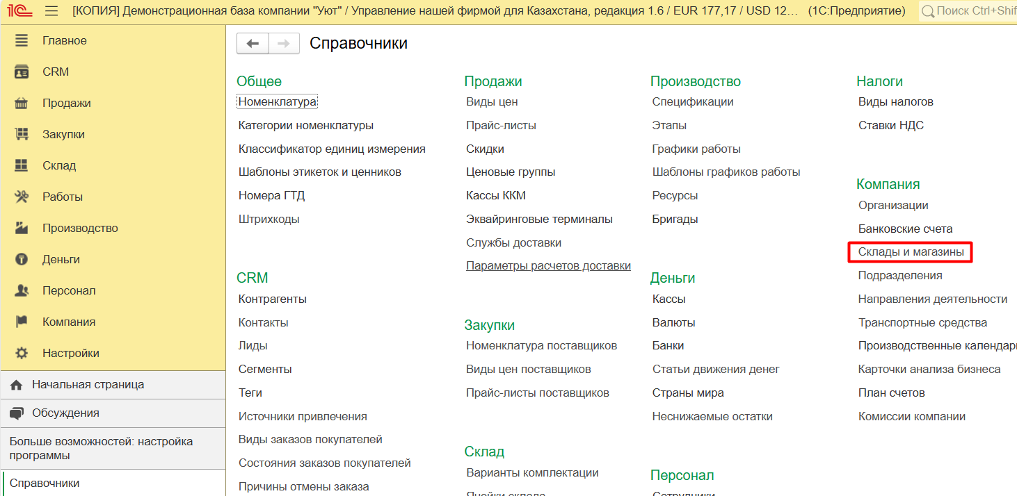После этого создаем склад. Для этого открываем справочник Склады и создаем новый элемент.
