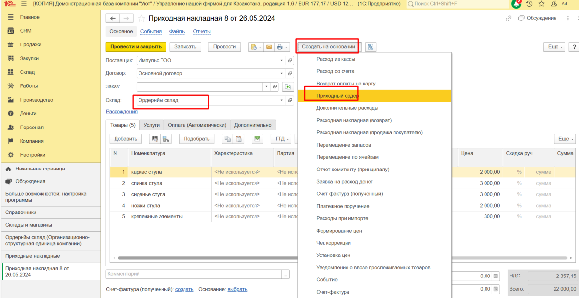 2. Ордерная схема закупок в 1С: УНФ для Казахстана