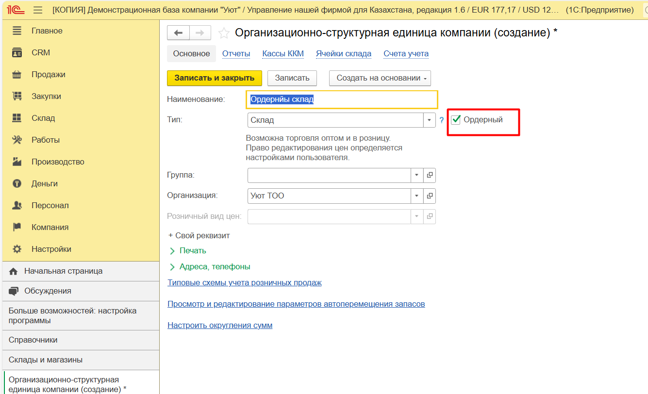 Заполняем наименование, галочку – Ордерный склад, тип – Склад.