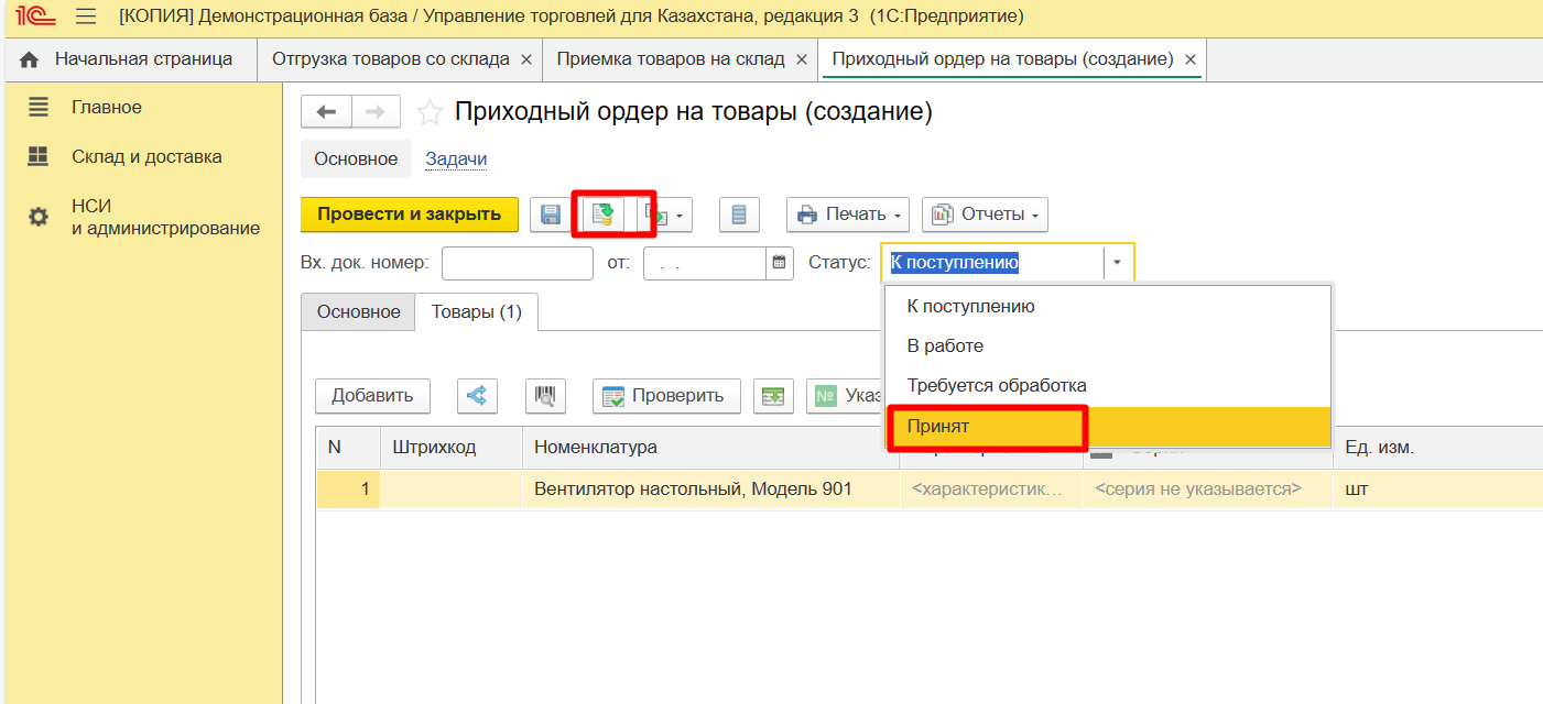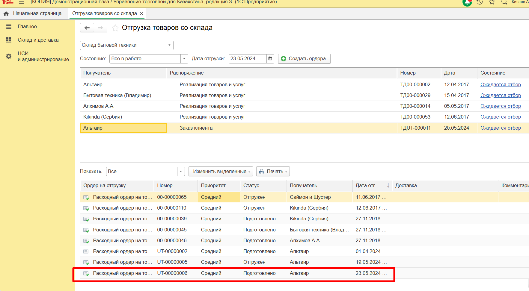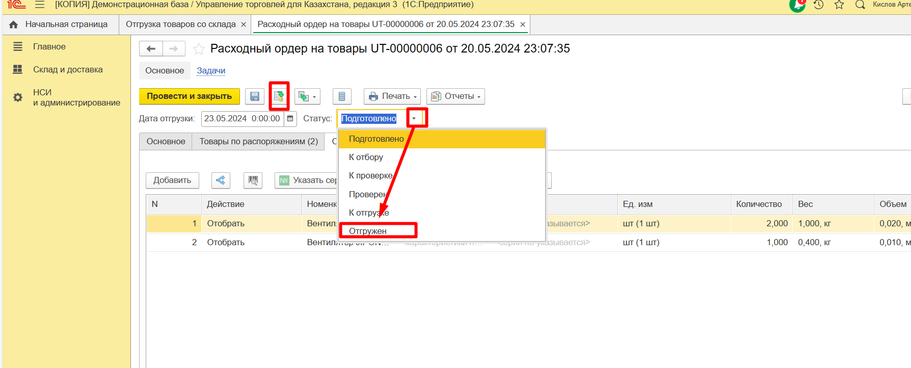 Открываем ордер и для отгрузки меняем статус на Отгружен. В реальной работе статусы будут меняться постепенно. Проводим документ.