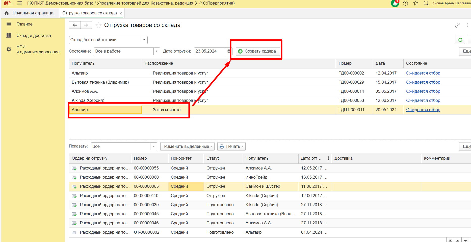 Теперь переходим в рабочее место кладовщика по оформлению расходных ордеров. Находим нужное распоряжение (заказ клиента) и нажимаем на кнопку Создать ордера.