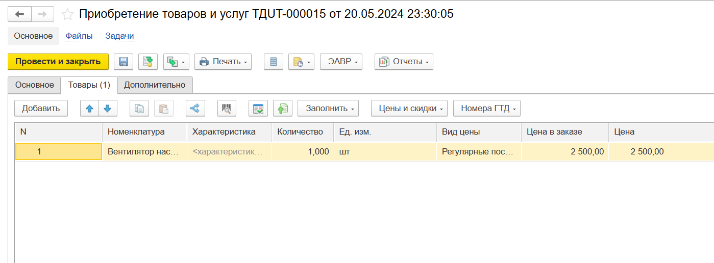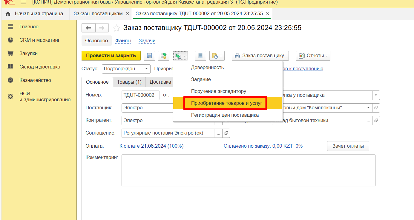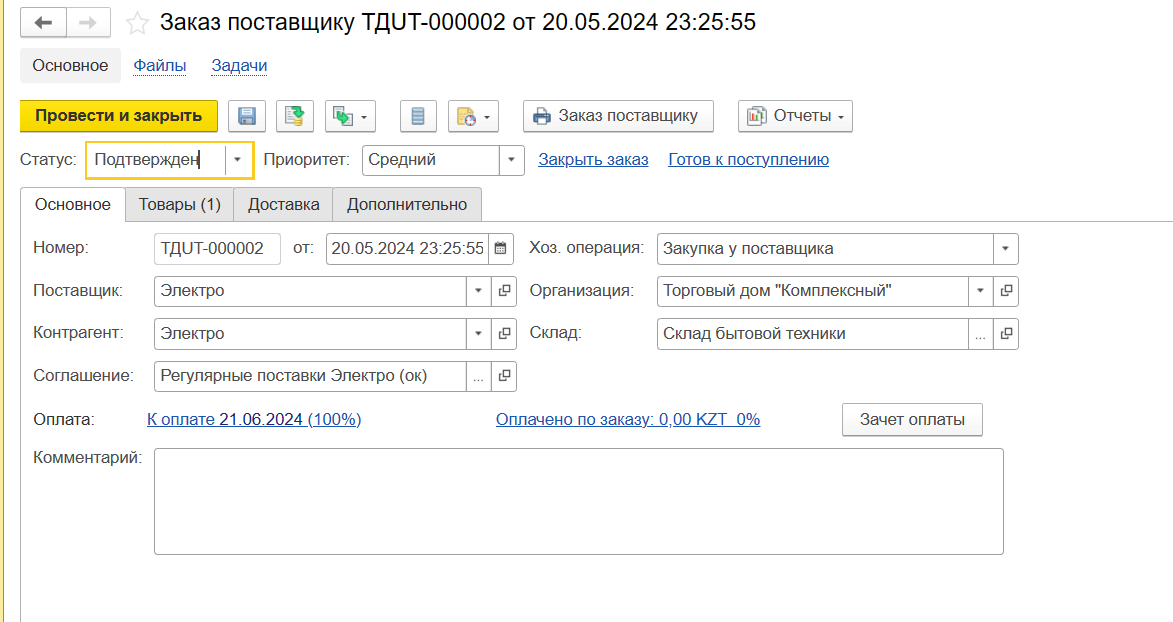 Создадим заказ поставщику в 1С (как создать документ был рассмотрен в прошлой статье).