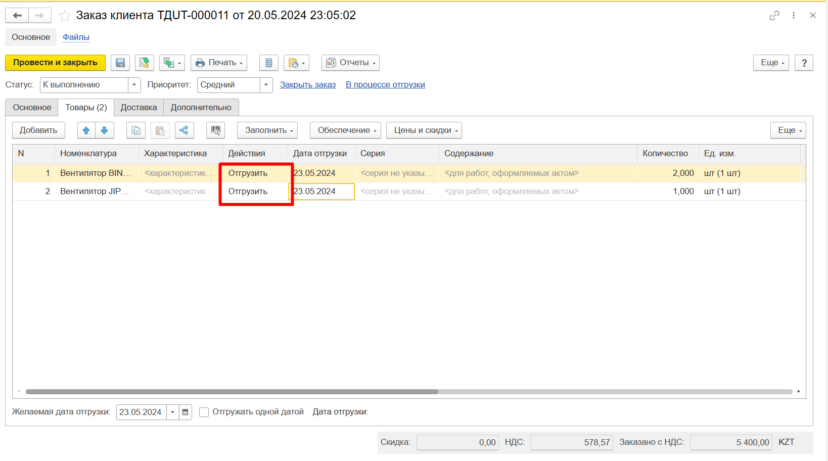 На вкладке Товары для отгружаемых товаров необходимо установить действие Отгрузить.