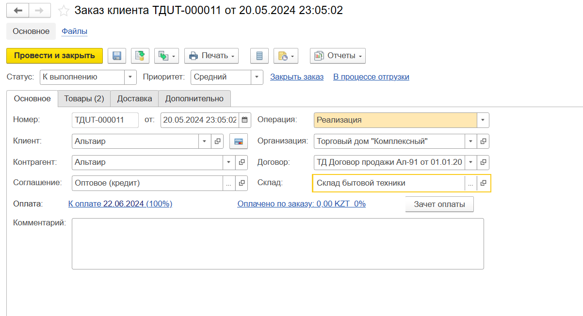 Создаем документ заказ клиента (процесс оформления заказа клиента был рассмотрен в предыдущей статье).