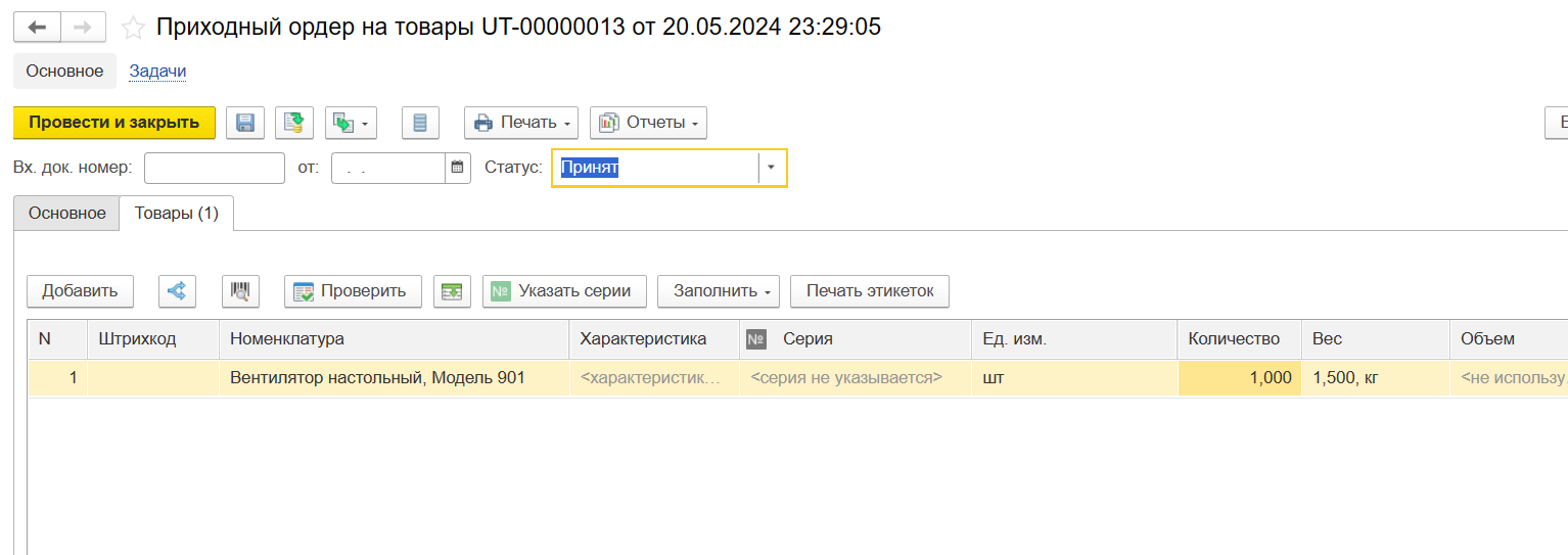 Далее создаем приходную накладную в 1С (процесс оформления документа был рассмотрен в предыдущей статье) и проводим документ.