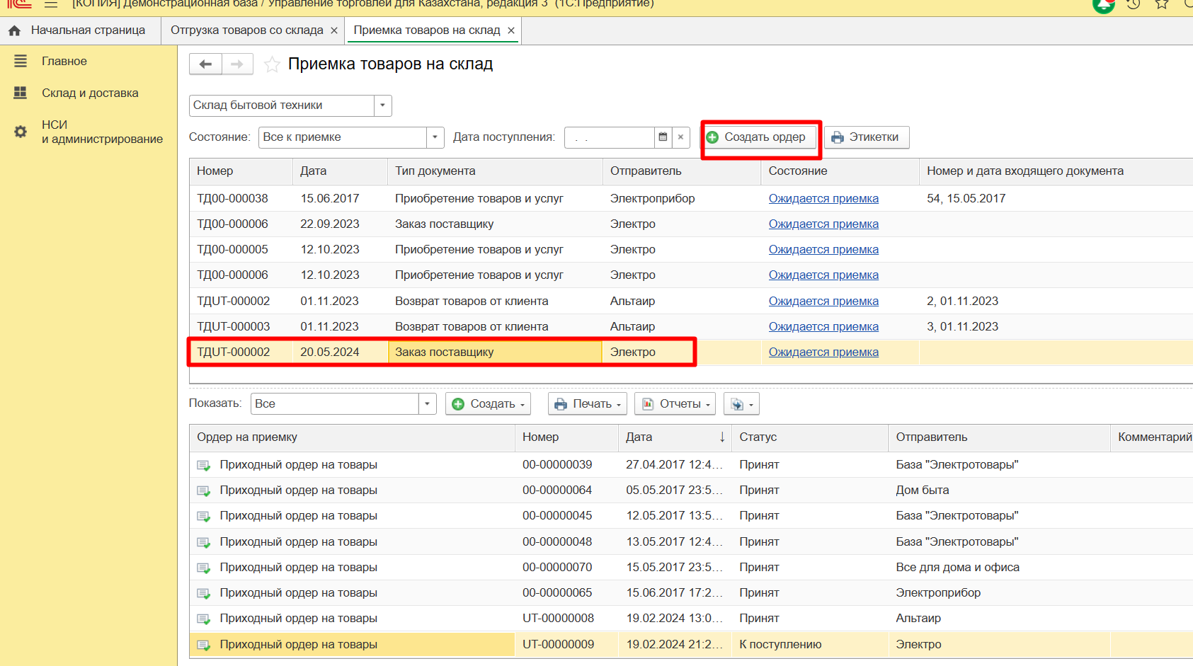 Далее переходим в рабочее место кладовщика по оформлению приходных ордеров, и создаем ордер, выделив нужное распоряжение.
