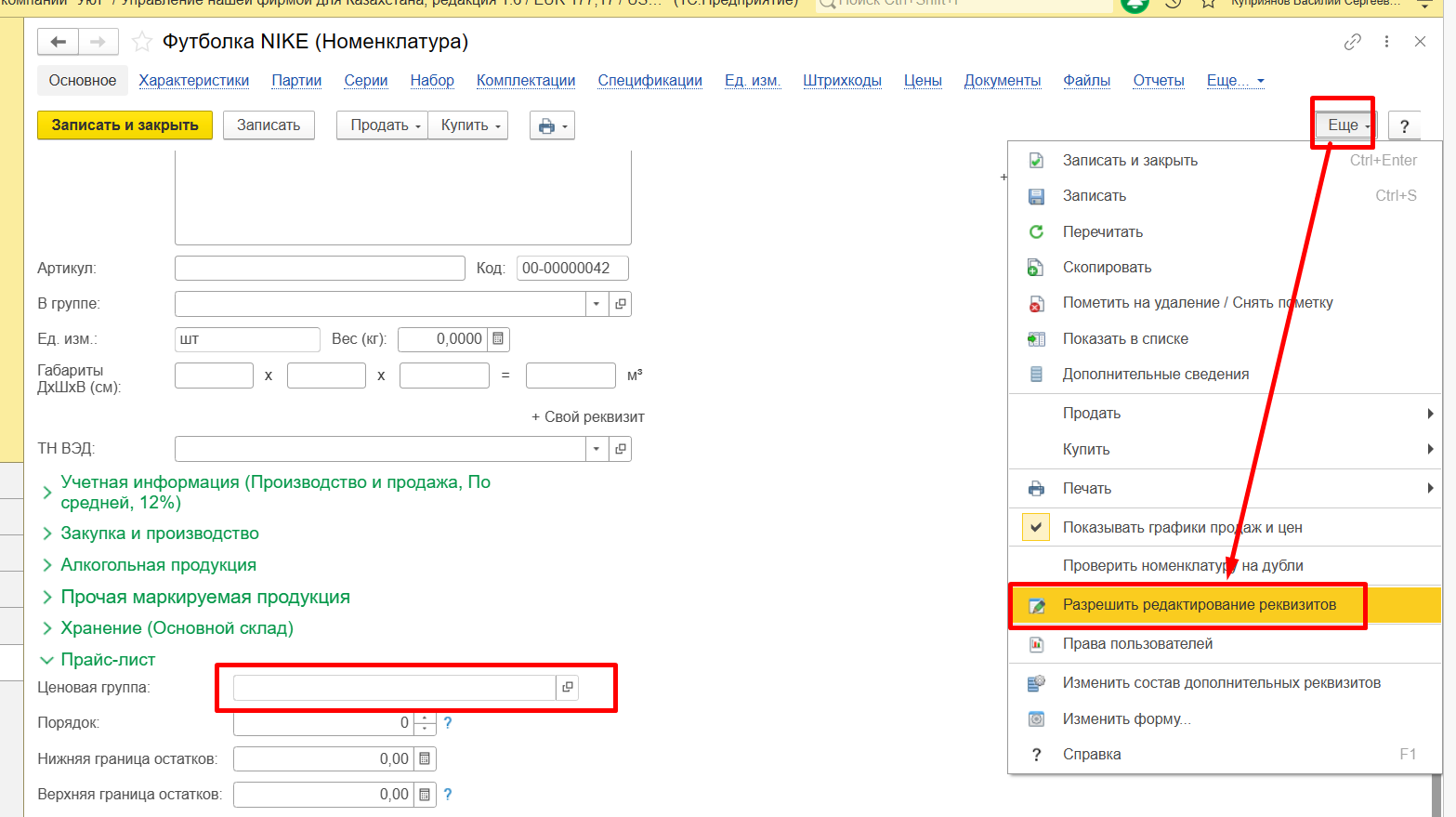 Далее необходимо назначить ценовые группы в 1С для номенклатуры. Для этого открываем карточку товара в 1С, нажимаем на кнопки Ещеà Разрешить редактирование реквизитов.
