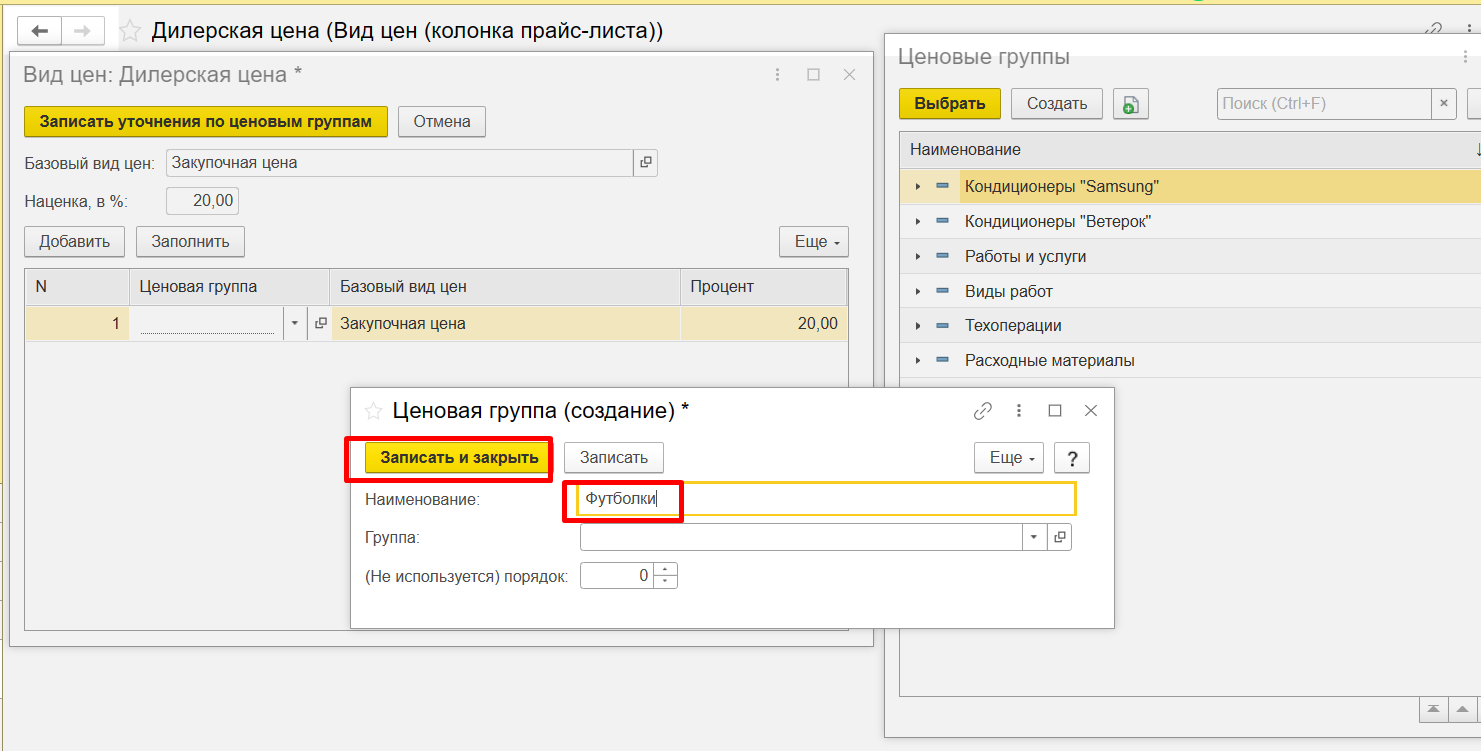 Заполняем ценовые группы в 1С, определяем базовые цены для расчета и процент наценки. Записываем уточнения по ценовым группам в 1С.