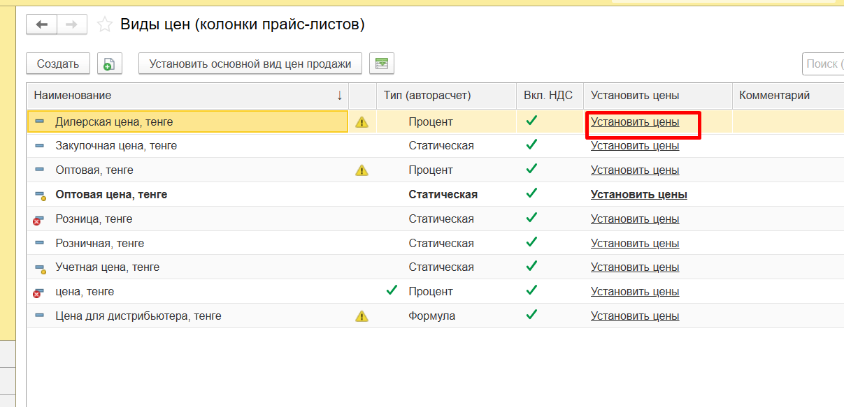 Далее переходим в справочник видов цен, находим необходимый вид цен и нажимаем на кнопку Установить цены.