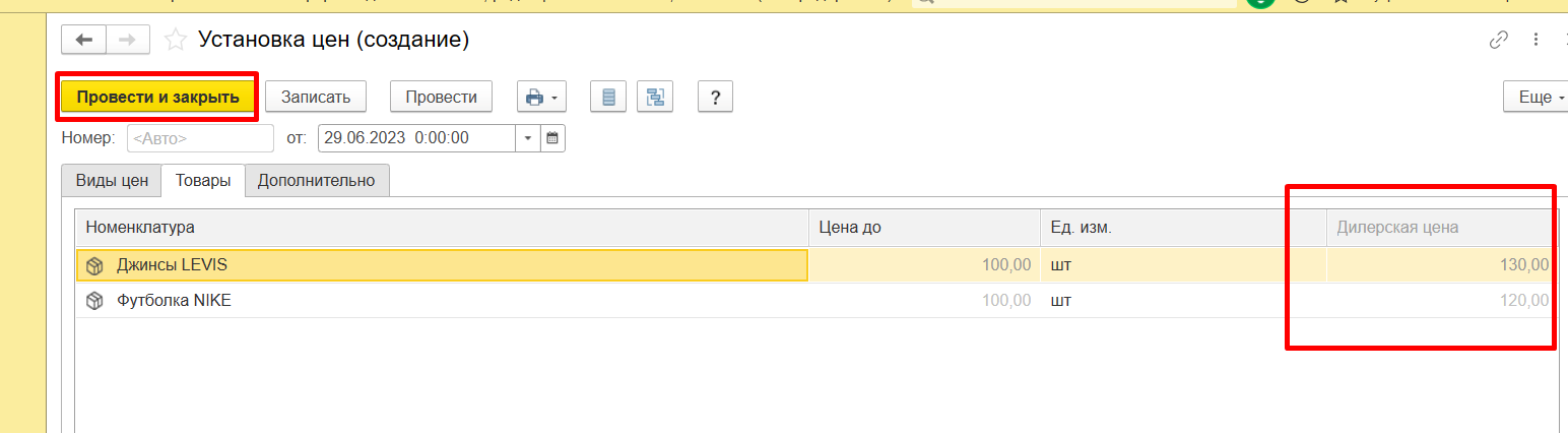 Сформируется документ установки цен с рассчитанной ценой, закупочная цена у товаров была одинаковая, но цена продажи рассчиталась по разным наценкам, потому что у товаров разные ценовые группы в 1С и проценты наценок.
