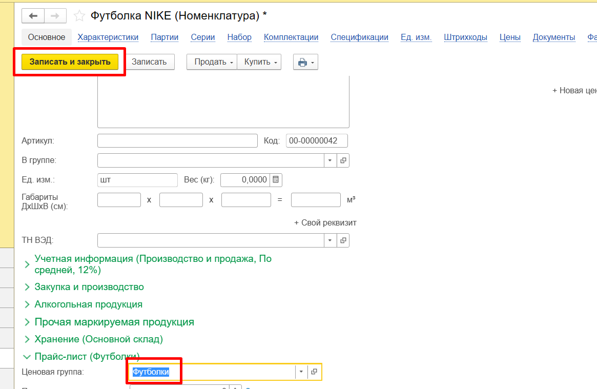 Заполняем ценовую группу в 1С и сохраняем карточку товаров в 1С.