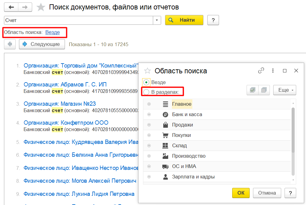 Например, при вводе слова «Счет» поиск выдаст все возможные результаты, содержащие данное слово.