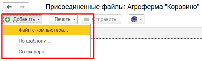 - Файл. Выбрать файл, который необходимо присоединить. Добавить можно фалы напрямую с компьютера, из заранее настроенного шаблона или со сканера, если сканер подключен к 1С.