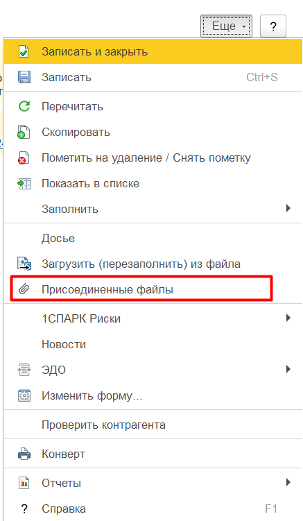 1. Открыть форму объекта (элемента справочника, документа и т.п.), к которому необходимо присоединить файл.