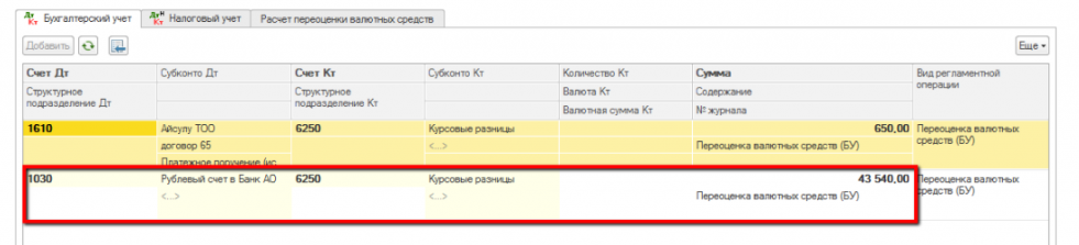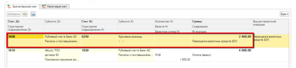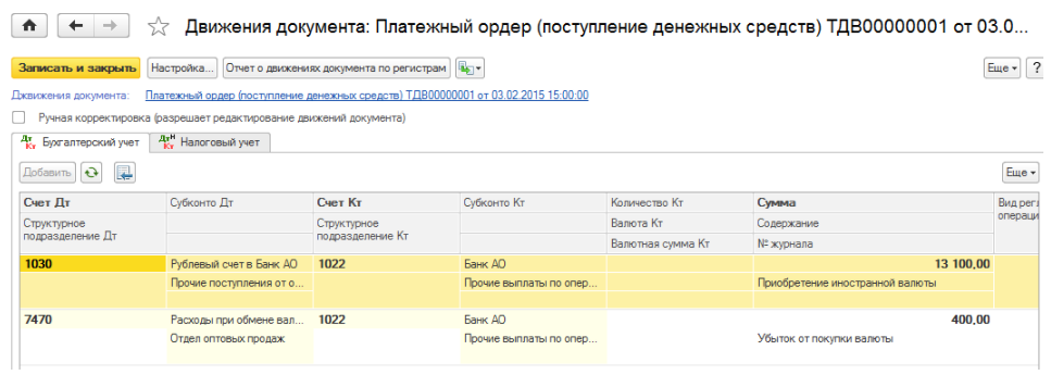 Далее, внутри этого документа, как было показано выше, были автоматически созданы проводки, относительно поступления зарубежной валюты, а также отобразятся убытки и будет показана суммовая разница.