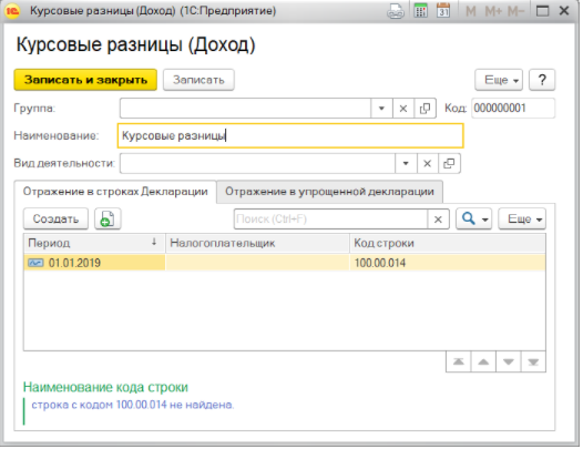 1. Открыть справочник «Доходы для статьи курсовые разницы». Внутри данного справочника должен быть корректный код в строке «Декларации», относительно корпоративного подоходного налога. Это отображено на примере ниже: