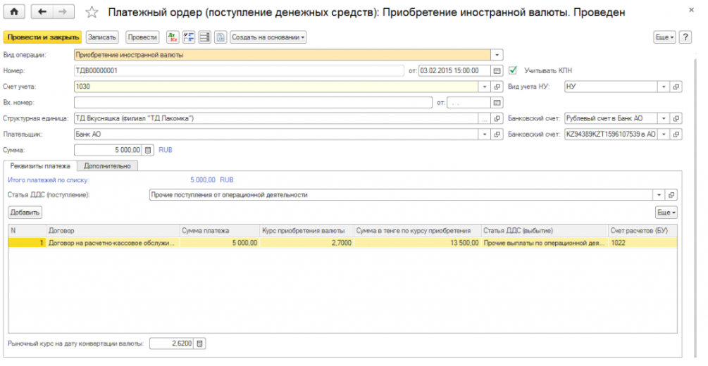 Пусть в начале месяца была куплена какая-то сумма рублей по одному курсу в тенге, а курс продажи в банке выше. Тогда платёжный ордер по поступлению денежных средств 1С будет в конфигурации выглядеть таким образом: