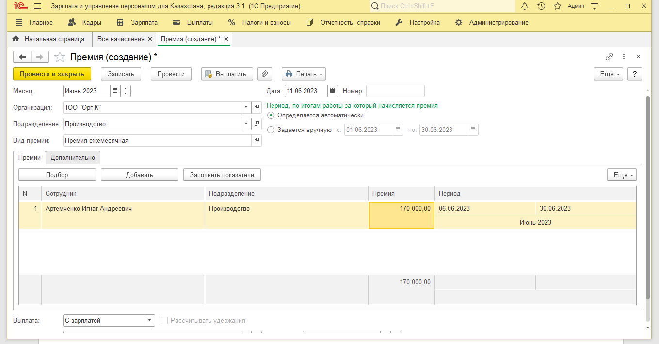 Премия вводится суммой или рассчитывается по формуле в документ: Премия ЗУП. Кроме этого, возможно ее добавить вручную в документ «Начисление заработной платы и взносов». Удержание, расчет налогов и выплата происходит по тому же принципу что и отпуск, разовое начисление.