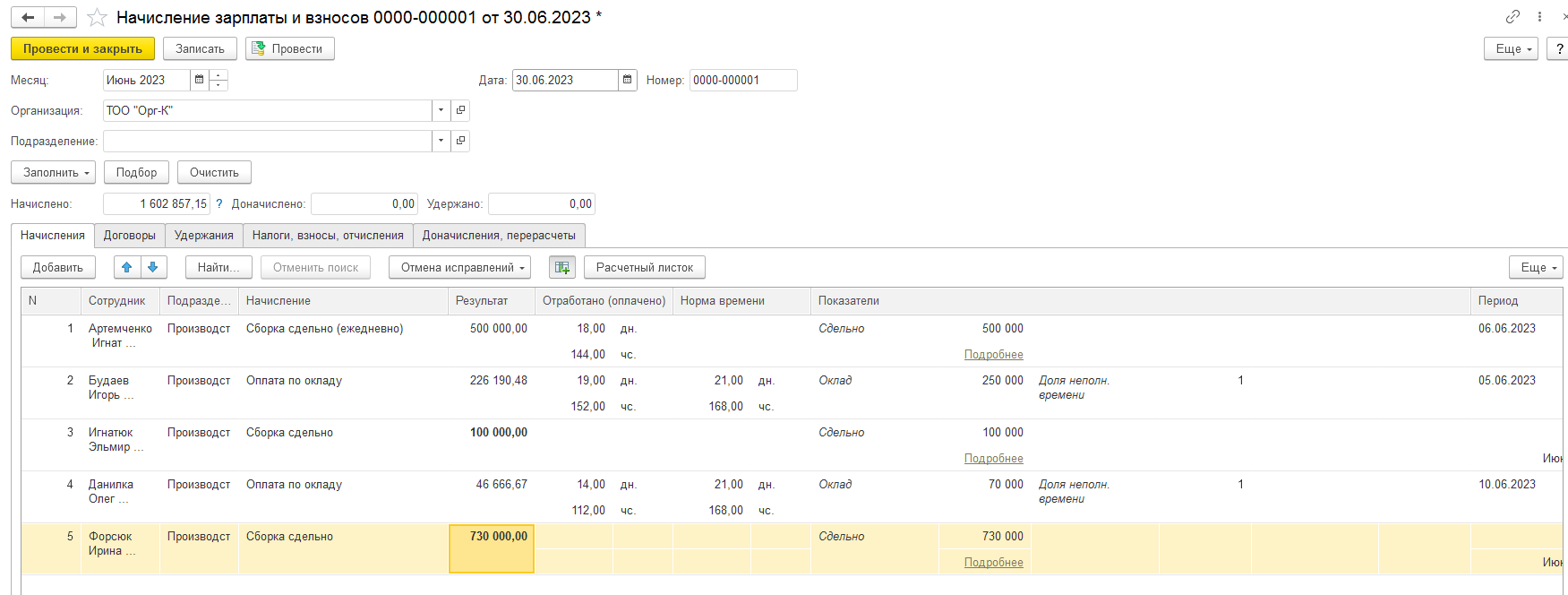 После того, как в программе зарегистрированы все невыходы (отпуск, больничный, прогул), вводится Документ «Начисление заработной платы и взносов», удержаний, начисления налогов, который рассчитает зарплату и налоги с нее за фактически отработанные время. Табель вводить не обязательно. Но, к примеру, когда необходимо рассчитать доплату за работу в ночное время, то потребуется табель, куда необходимо проставить количество ночных часов. Если на предприятии существует сдельная оплата труда, то вводятся показатели для расчета сделки (в разделе зарплата---данные для расчета зарплаты) и специальное начисление с назначением начисления «сдельная оплата труда» и формулой для расчета.