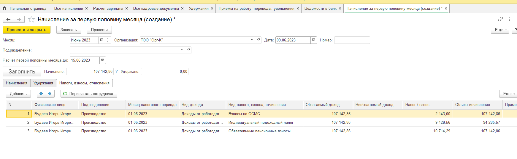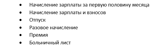 Начисление зарплаты за первую половину месяца и Начисление зарплаты и взносов, хоть и разные документы, но зависимы, и в момент выплаты зарплаты программа вычтет аванс. Отпуск, разовое начисление, премия, больничный лист могут быть как самостоятельными начислениями, так и соединяться с заработной платой.