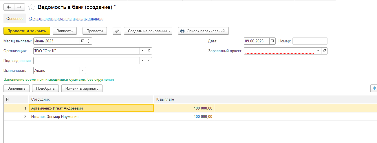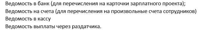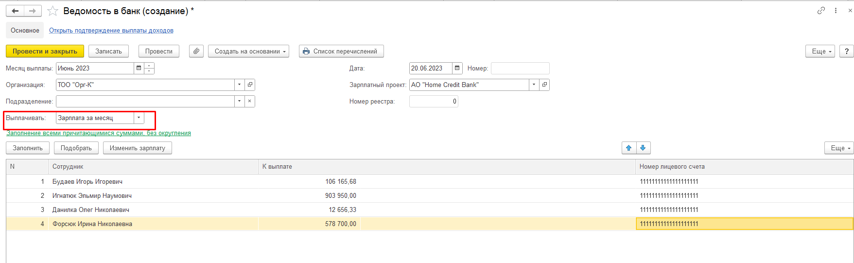 Если выбрать «Фиксированной суммой» или «Процентом от тарифа», то начислять аванс не потребуется, сразу переходим на формирование ведомости в банк
