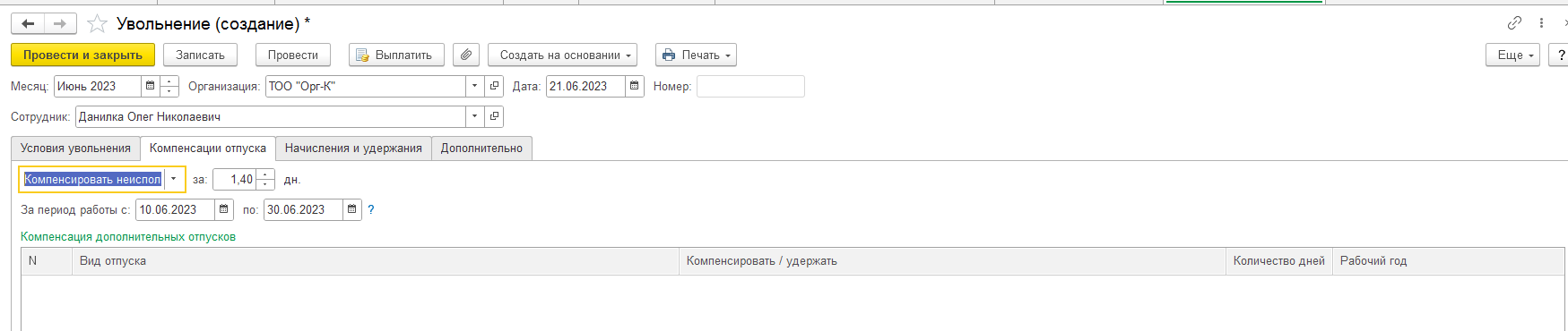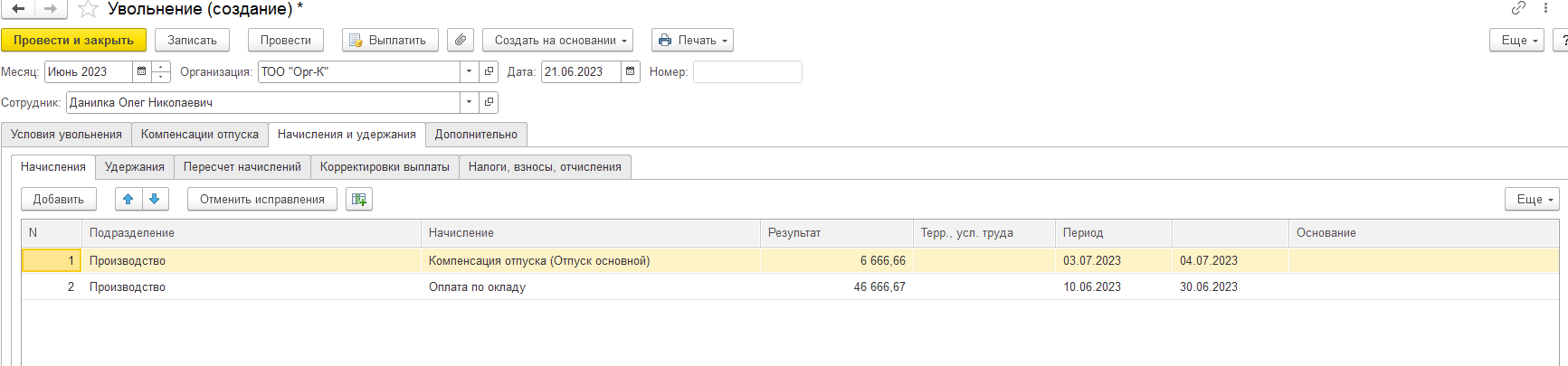 Документ «Увольнение», комбинированный документ, который под ключ рассчитает все виды выплат при увольнении: окончательный расчет заработной платы, компенсацию за отпуск или напротив удержание отпуска, налоги уплачиваемые сотрудником, удержания. Кроме этого, в документе рассчитываются налоги с фонда оплаты труда, уплачиваемые работодателем.