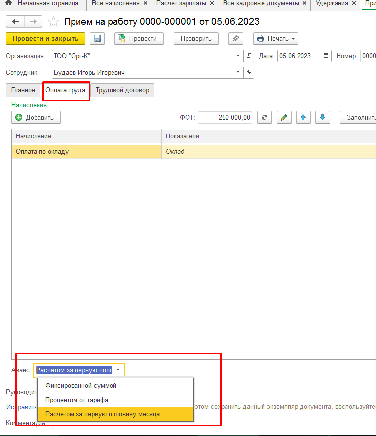 1. Начисление зарплаты за первую половину месяца (аванс)