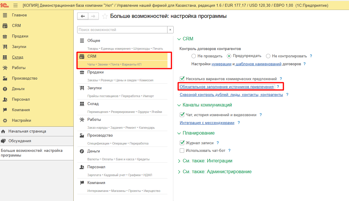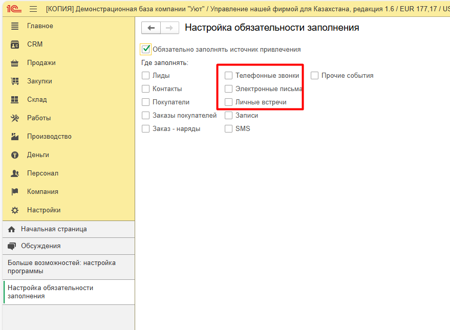 Регистрация событий во взаимоотношениях с клиентами доступна по умолчанию, но в системе есть настройка, которая позволяет включить поле Источник привлечения в состав реквизитов документов событий. В настройке указывается обязательность заполнения и документы события, в которых нужно будет заполнять данное поле. Настройка находится в разделе CRM.