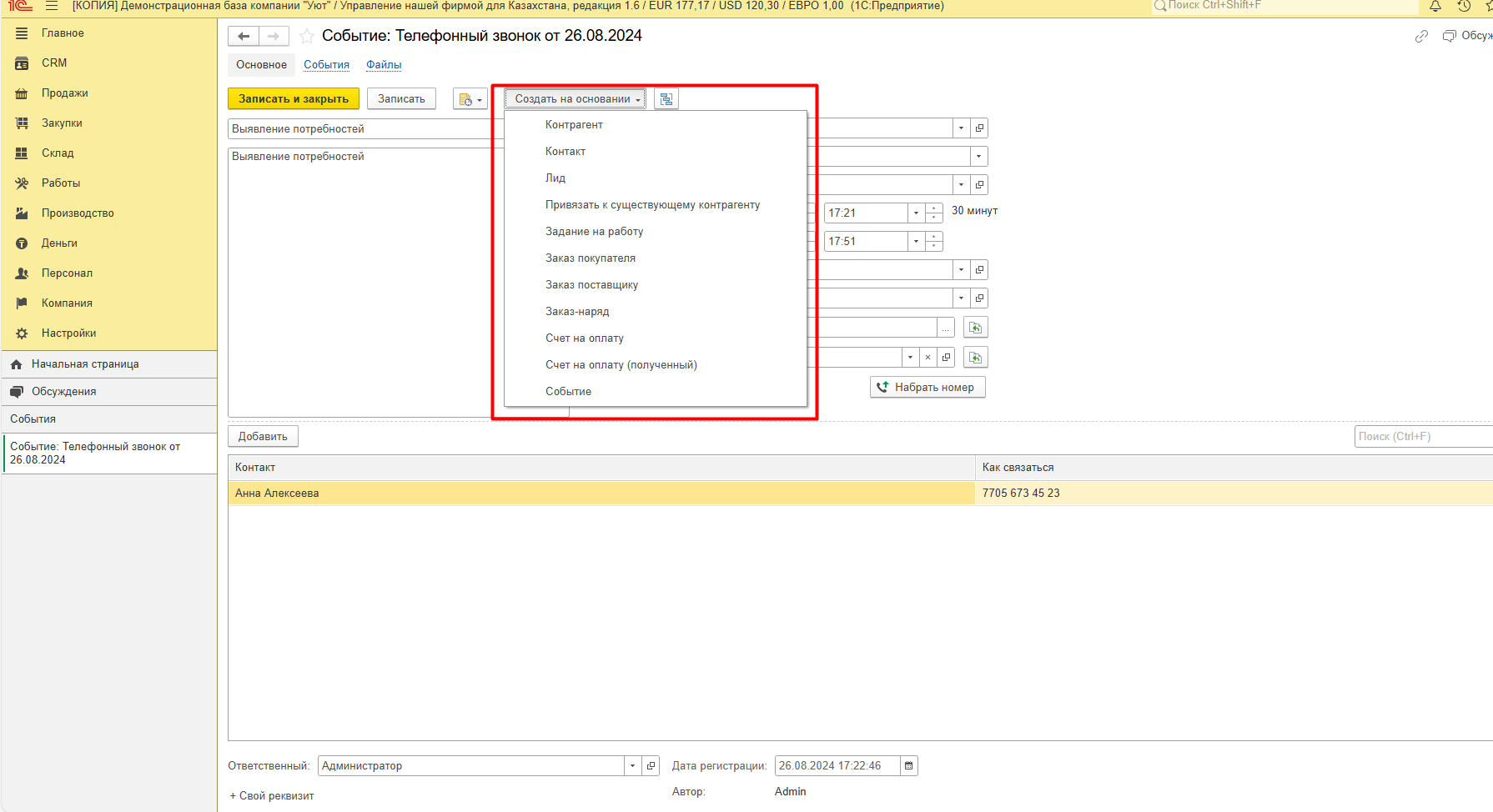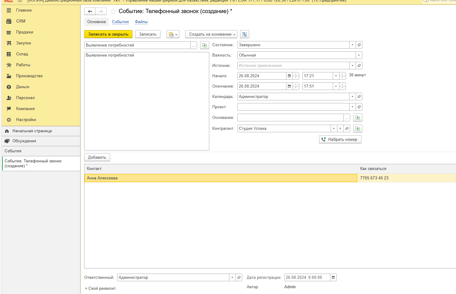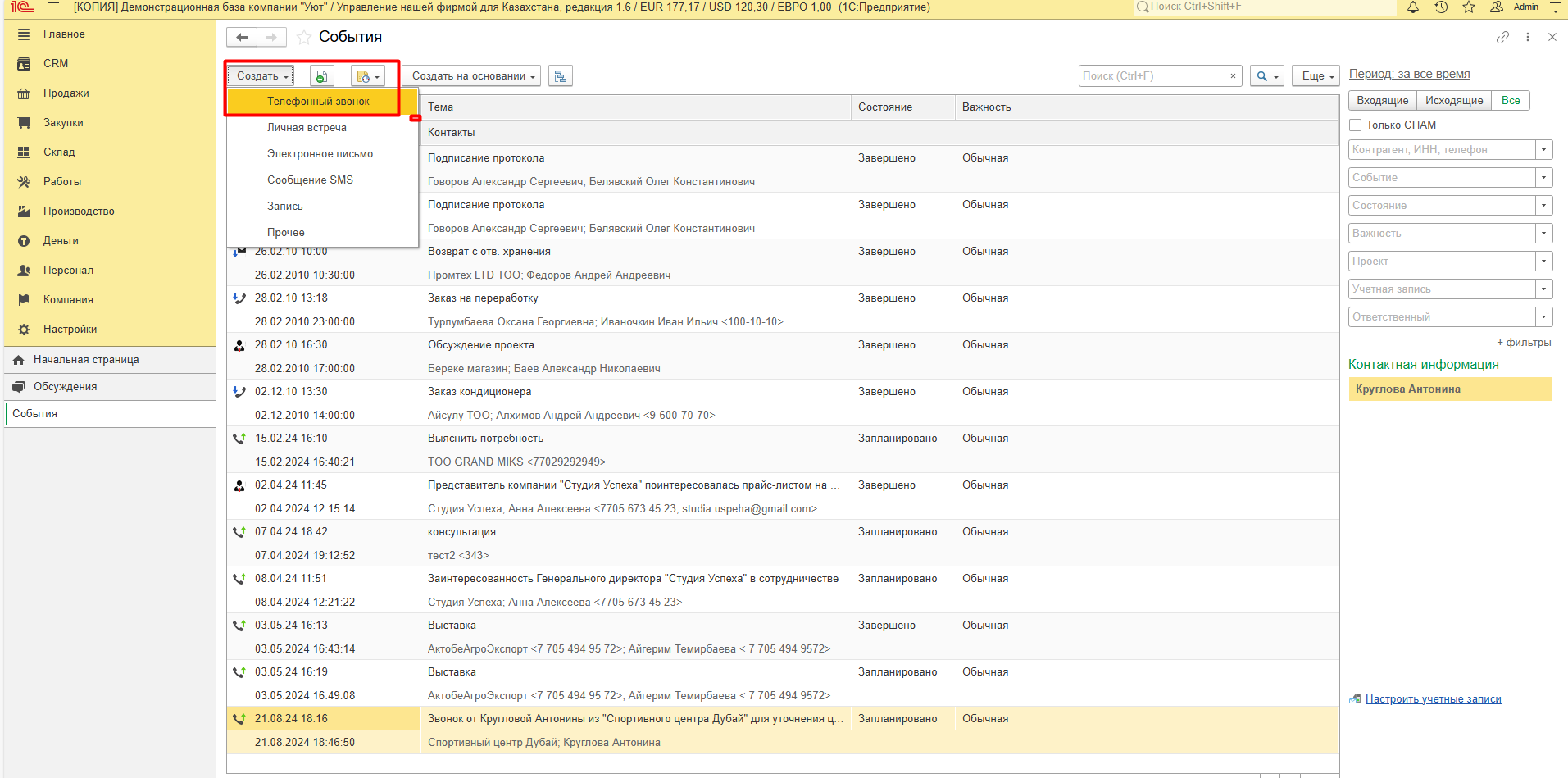 2. Регистрация событий взаимоотношений с клиентами в системе 1С: УНФ для Казахстана