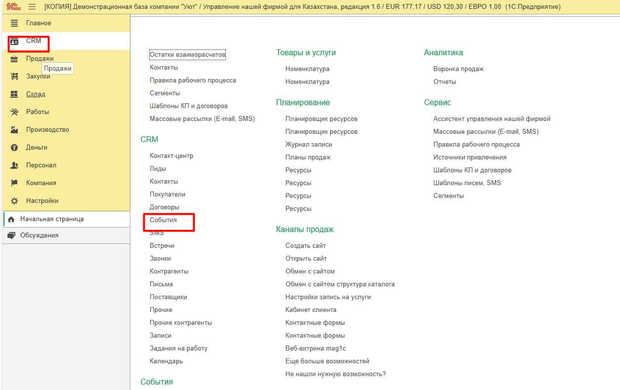 Для регистрации событий взаимоотношений с клиентами переходим в подсистему CRM и открываем журнал событий в 1С.