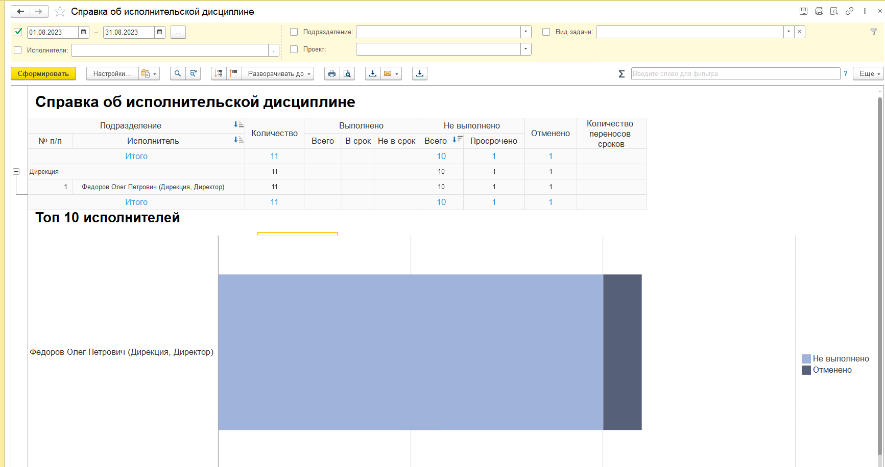 Формируются подробные отчеты о поступивших и исполненных документах, а также о просроченных задачах, обеспечивая полный контроль и информированность.