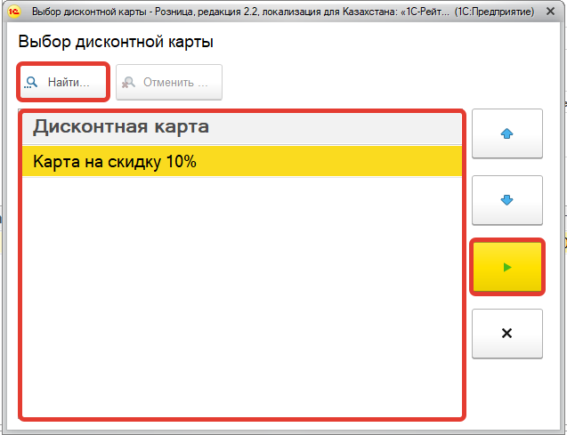 Выбираем дисконтную карту, по которой будет осуществляется скидка, или пользователя. Для того, чтобы осуществить поиск по картам, можно нажать на «Найти» и ввести наименование карты. После чего нажмите на кнопку продолжить (play).