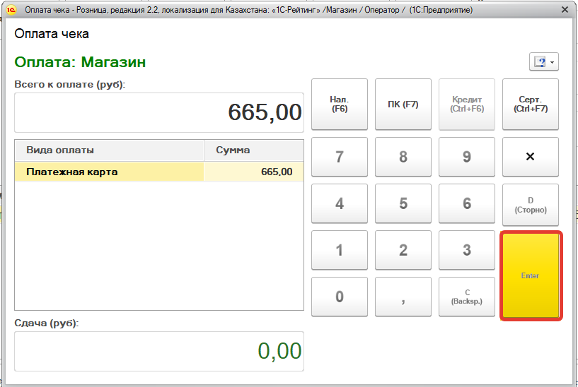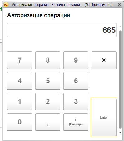 После нажатия Плат. карта выходит окно авторизация операции, нужно будет на экваринговом терминале набрать сумму в нашем случаи 665 и нажать Enter.