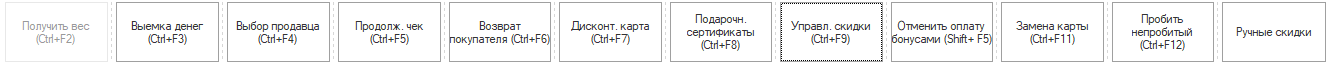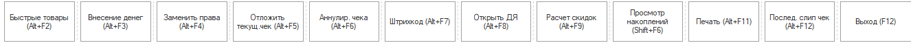 Теперь разберем нижнюю панель функций. На рисунке показаны все кнопки, доступные в режиме кассира, так же можно их настроить в настройка режима кассира (Настройка РМК).
