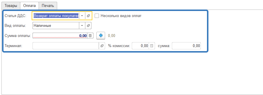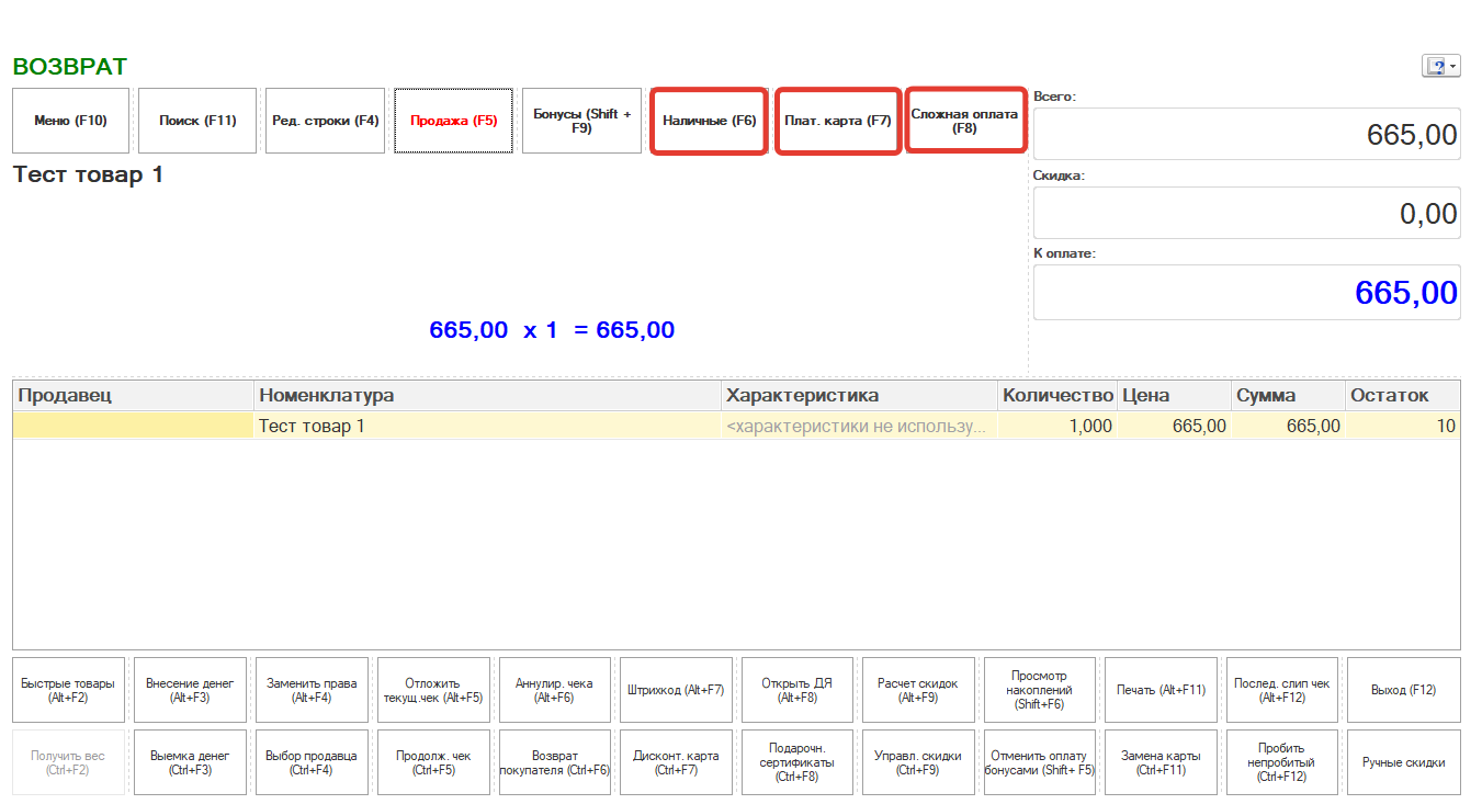 И проводим возврат товара тем способом, которым была продажа. То есть, если у нас была продажа картой, то и возвращаем тоже Плат. картой, если сложной оплатой, то так же и делаем возврат.