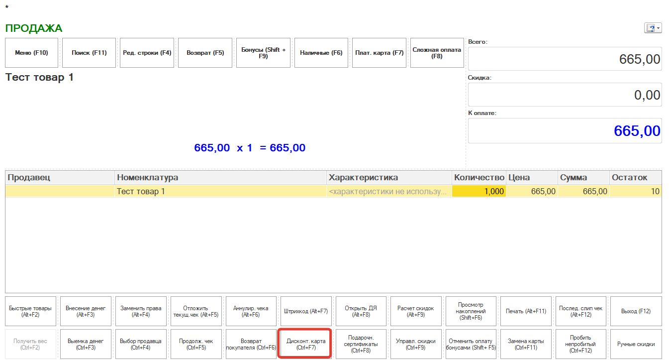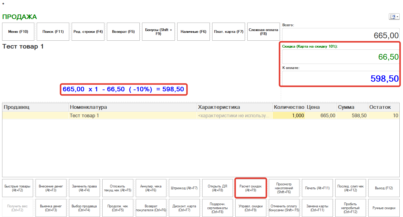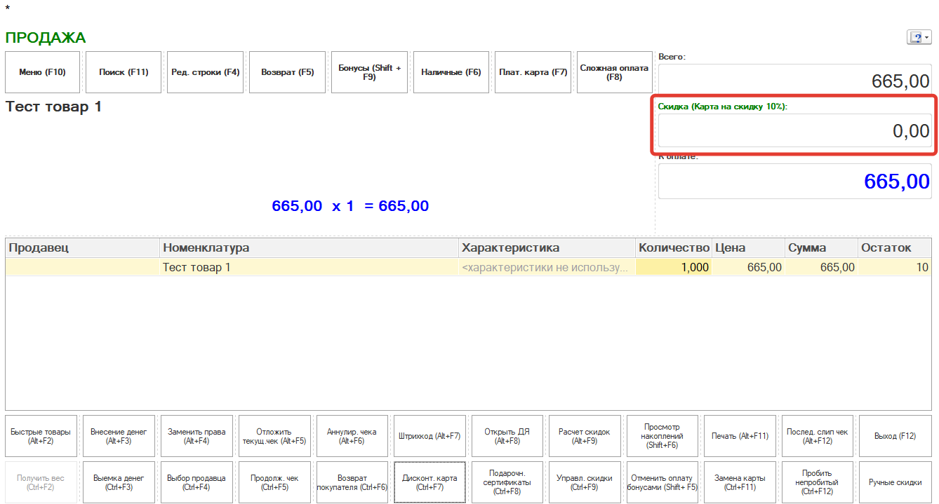 После чего в подсчёте общей суммы в поле скидка появляется Скидка (Карта на скидку 10%), но поле со скидкой стоит на 0,00. Чтобы сделать расчет скидки, нужно нажать на нижней панели кнопку Расчет скидок или продать товар (в этом случае пойдет расчет скидки).