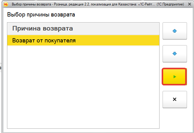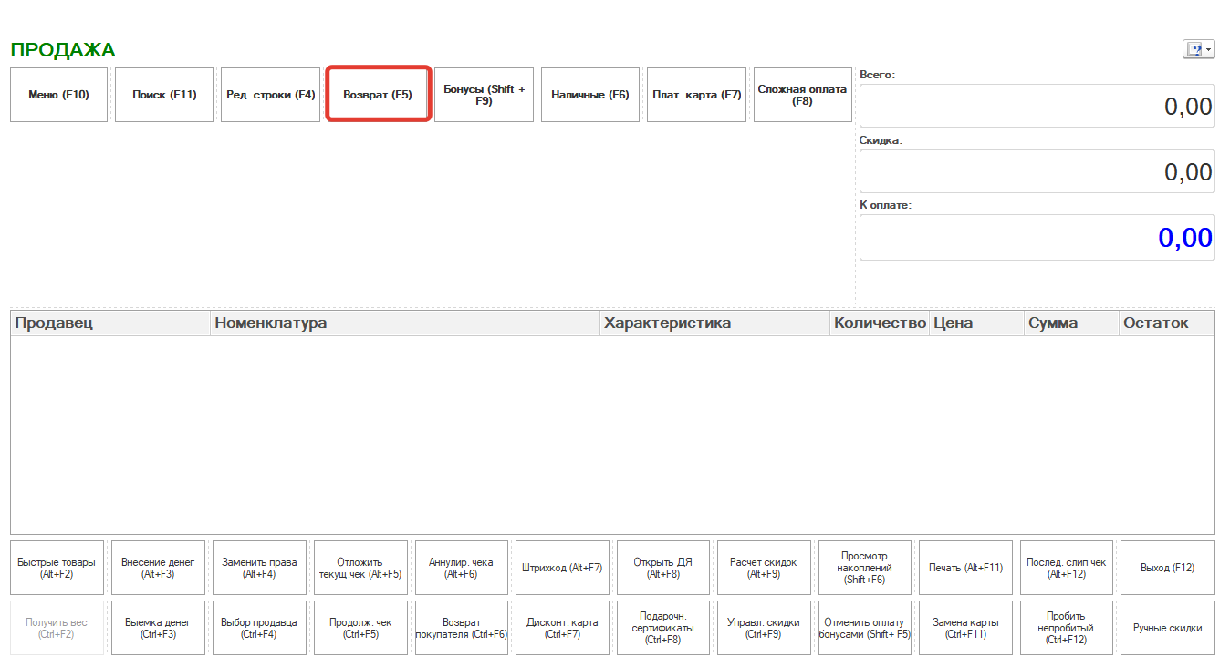Так же можете заметить, что кнопка возврат заменилась на продажу если клиент не захотел возвращать товар или передумал, то можно нажать на кнопку продажа и вернуться обратно в режим продаж.