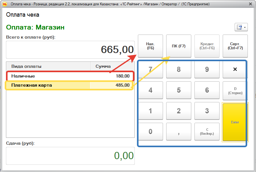 Появится окно с выбором. Красным отмечено Наличная оплата, Желтым – Безнал. Что бы заполнить эти поля нажимаем Нал. (наличные) и вводим сумму на цифровой клавиатуре, так же и ПК (Платежная карта) и нажимаем Enter.