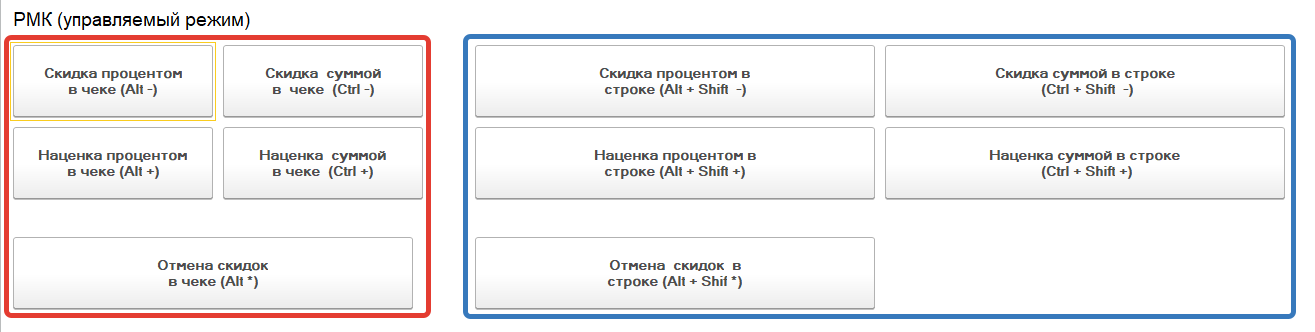 В синем поле отмечены скидки и наценки в строке - (НА ОТДЕЛЬНУЮ ПОЗИЦИЮ В ЧЕКЕ!) – Для того, чтобы сделать на одну позицию скидку/наценку, нужно щелкнуть на нее и нажать ручные скидки и выбрать в каком соотношении нам нужна скидка/наценка процентом или определенной суммой.