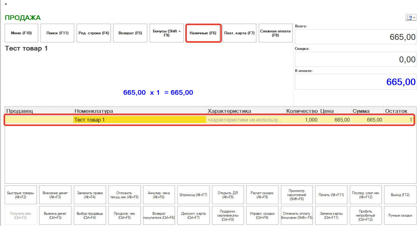 8. Расчет скидок – Работает при наличии дисконта при продаже. Так же скидка по дисконту будет рассчитываться при нажатии кнопки наличные.