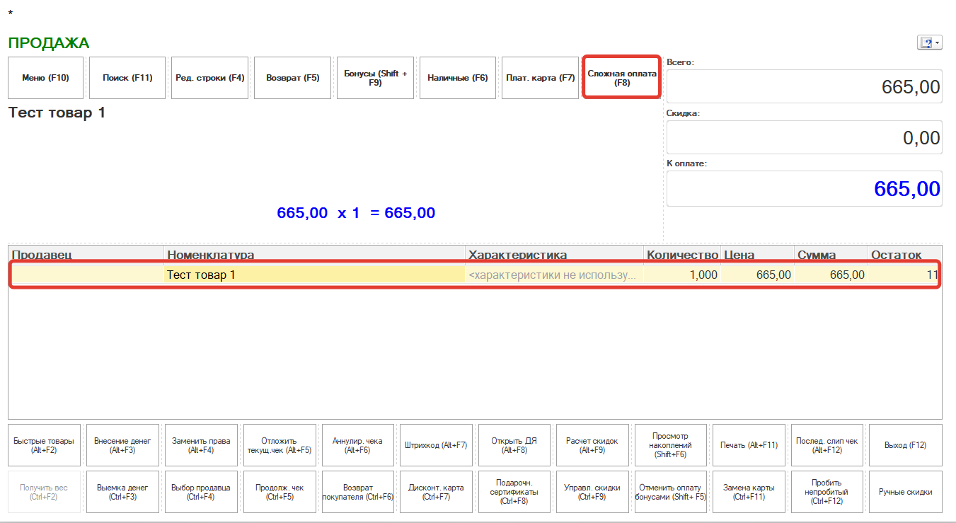 Сканируем товар сканером, вводим через поиск или через кнопку штрихкод. После нажимаем кнопку Сложная оплата.