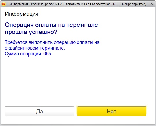 Если оплата прошла успешна по терминалу, то нажимаем «Да» и если не прошла, то соответственно «Нет».