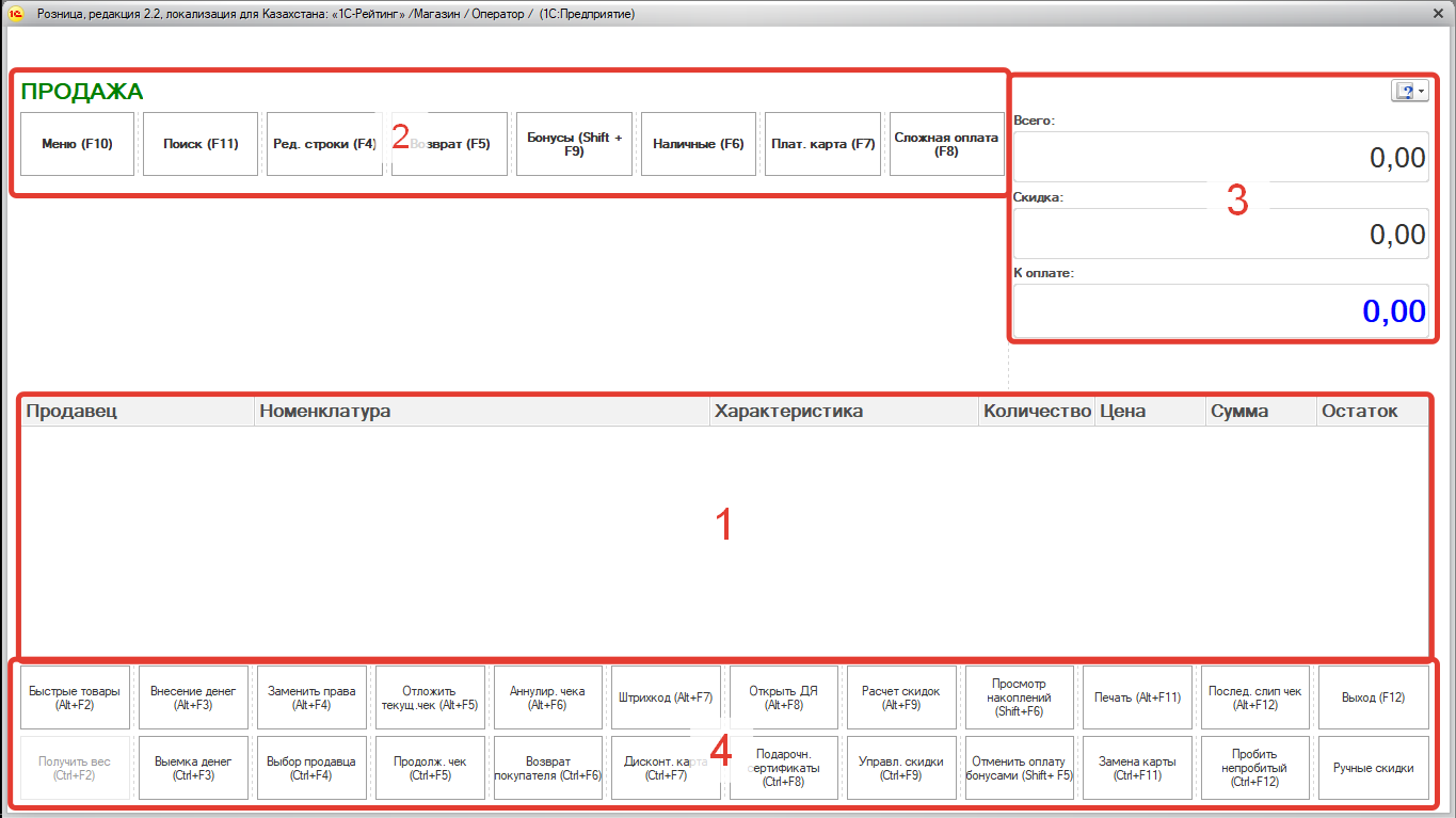 1. Меню – открывает и закрывает (скрывает) нижнюю панель функций для увеличения поля продаж.