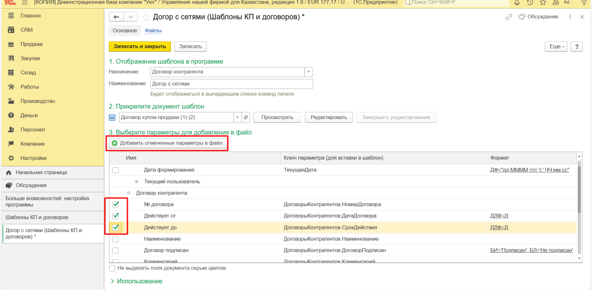 Далее отмечаем флажками те реквизиты, которые необходимо вывести в договор и нажимаем Добавить отмеченные параметры в файл.