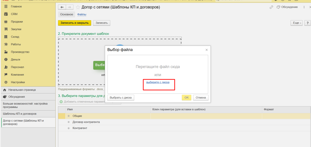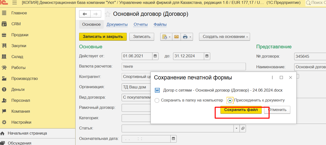Системы предложит сохранить файл договора на компьютер, либо прикрепить файл к договору в системе 1С: УНФ. Выбираем любой вариант.