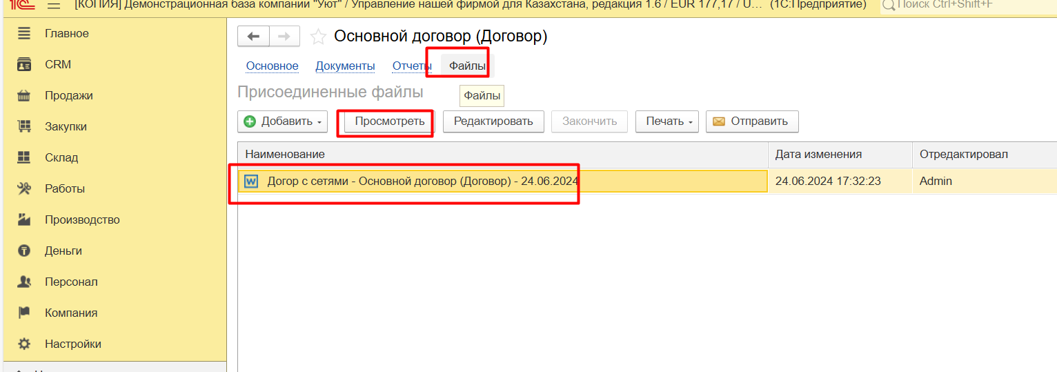 При прикреплении файла договора к договору в системе 1С: УНФ, переходим в файлы договора и нажимаем Посмотреть